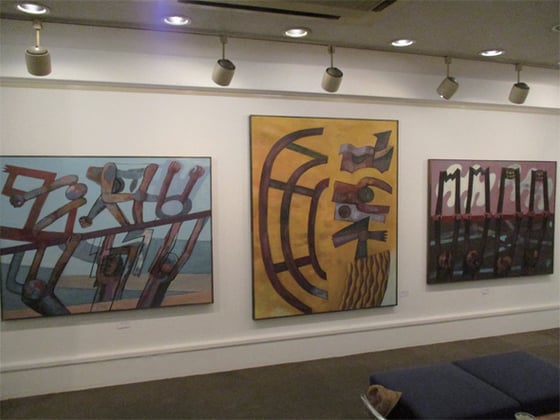初の個展を千駄木画廊の初期からの作品群を観て感じたのは、実体を支える空間との関係性が、まっとうな解釈として、正直に伝わって来た。全うとは近作の諸作の平面空間に実在する独特な記号的な具象像が配置され、緊密な平面を成している。